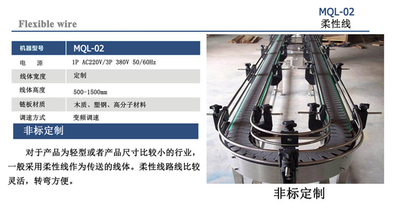 对于产品为轻型或者产品尺寸比较小的行业, 一般采用柔性线作为传送的线体。柔性线路线比较 灵活,转弯方便。
