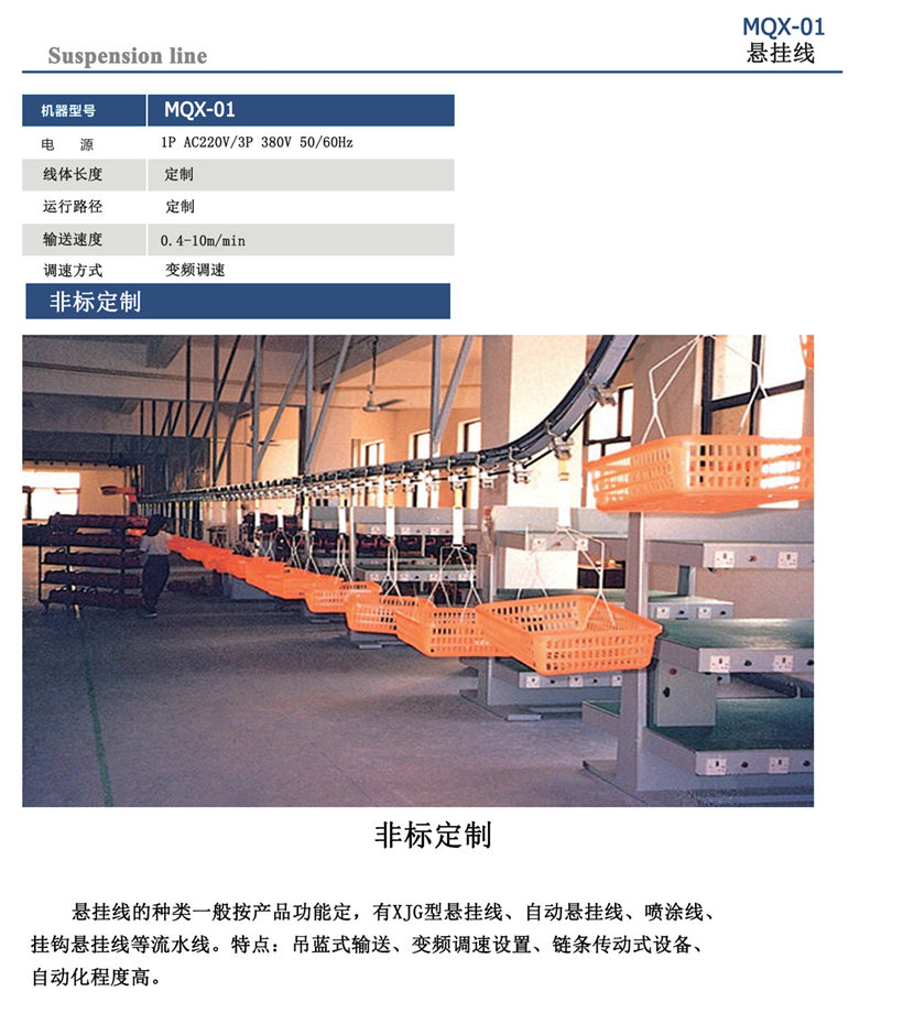 悬挂线的种类一般按产品功能定,有XJG型悬挂线、自动悬挂线、喷涂线、 挂钩悬挂线等流水线。特点:吊蓝式输送、变频调速设置、链条传动式设备、 自动化程度高。