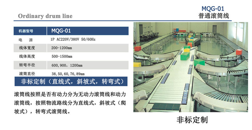 滚筒线按照是否有动力分为无动力滚筒线和动力 滚筒线,按照物流路线分为直线式,斜坡式(爬 坡式),转弯式滚筒线。