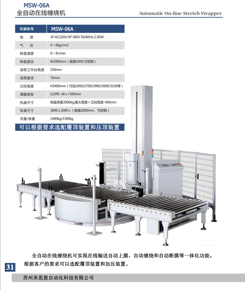全自动在线缠绕机可实现在线输送自动上膜、自动缠绕和自动断膜等一体化功能。 根据客户的要求可以选配覆顶装置和加压装置。