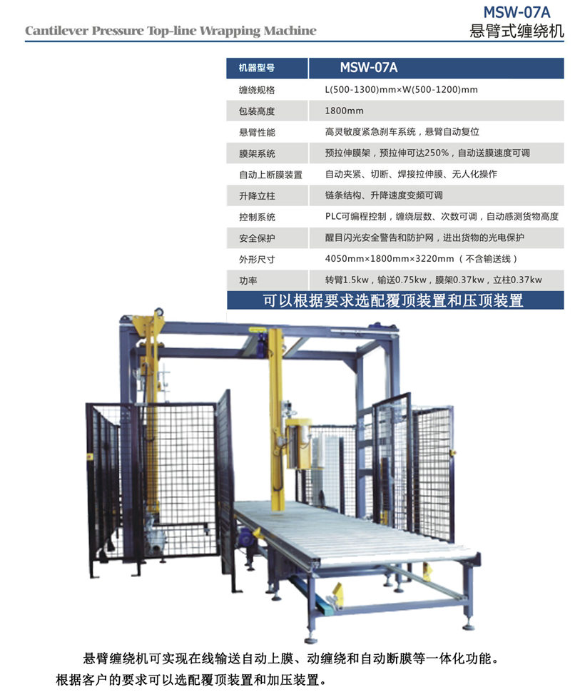 悬臂缠绕机可实现在线输送自动上膜、动缠绕和自动断膜等一体化功能。