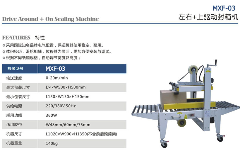 左右加上驱动封箱机适用于较大或较重型产品封箱。可根据纸箱规格,手工调节宽度及高度,简单和方便;上下一字型自动封箱,速度快,效率高。