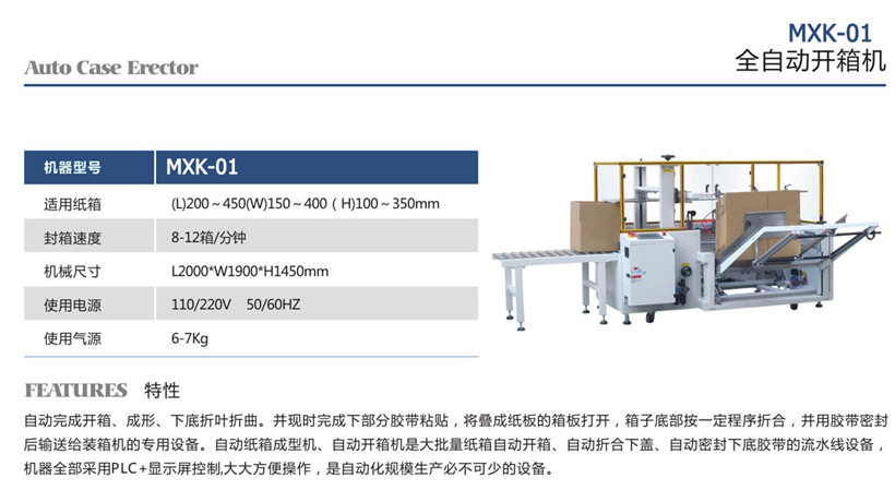 自动完成开箱、成形、下底折叶折曲。并现时完成下部分胶带粘贴,将叠成纸板的箱板打开,箱子底部按一定程序折合,并用胶带密封 后输送给装箱机的专用设备。自动纸箱成型机、自动开箱机是大批量纸箱自动开箱、自动折合下盖、自动密封下底胶带的流水线设备, 机器全部采用PLC+显示屏控制,大大方便操作,是自动化规模生产必不可少的设备。